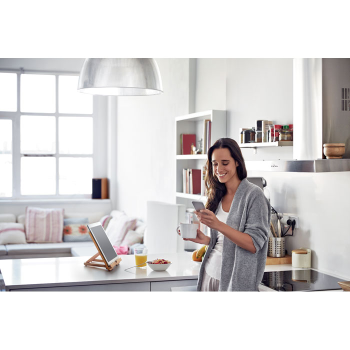 Składana podstawka pod tablet lub smartfon z bambusa. Bambus jest produktem naturalnym, dlatego mogą wystąpić nieznaczne różnice w kolorze, wzorze i rozmiarze.