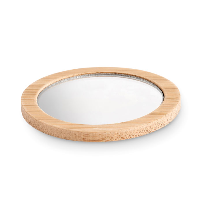 Okrągłe bambusowe jednostronne lusterko do makijażu. To małe lusterko jest idealnym niezbędnikiem, kiedy chcesz wykonać makijaż lub szybko sprawdzić, jak wyglądasz. Zapakowane jest w bawełniane etui z sznurkiem. Bambus jest produktem naturalnym, mogą wystąpić niewielkie różnice w kolorze i wielkości poszczególnych elementów, co może mieć wpływ na końcowy efekt dekoracji. FSC®-certified | FSC 100%, N5.7, FSC-C213206