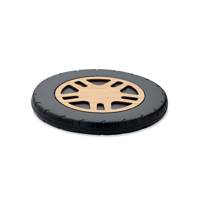 Bezprzewodowa ładowarka 15 W z ABS z recyklingu i bambusową nakładką. Kształt koła samochodowego. Podłącz urządzenie do komputera, umieść na nim smartfon i pozwól mu się naładować. Wyjście: DC 9V/1.10A (15W) do szybkiego ładowania. Kompatybilny z najnowszymi androidami, iPhone® 8 i nowszymi.