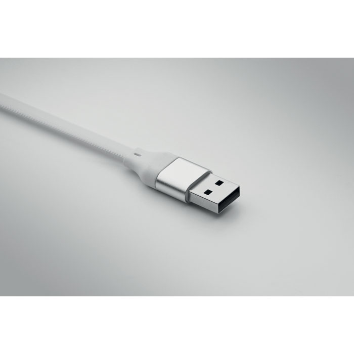 Kabel o mocy 60 W w obudowie z recyklingowanego ABS z brelokiem i podstawką na telefon. Wejście: 2-w-1 Typ-C i Typ-A. Wyjście: Typ-C i micro-B (2 w 1 pin). Długość kabla: 26 cm.