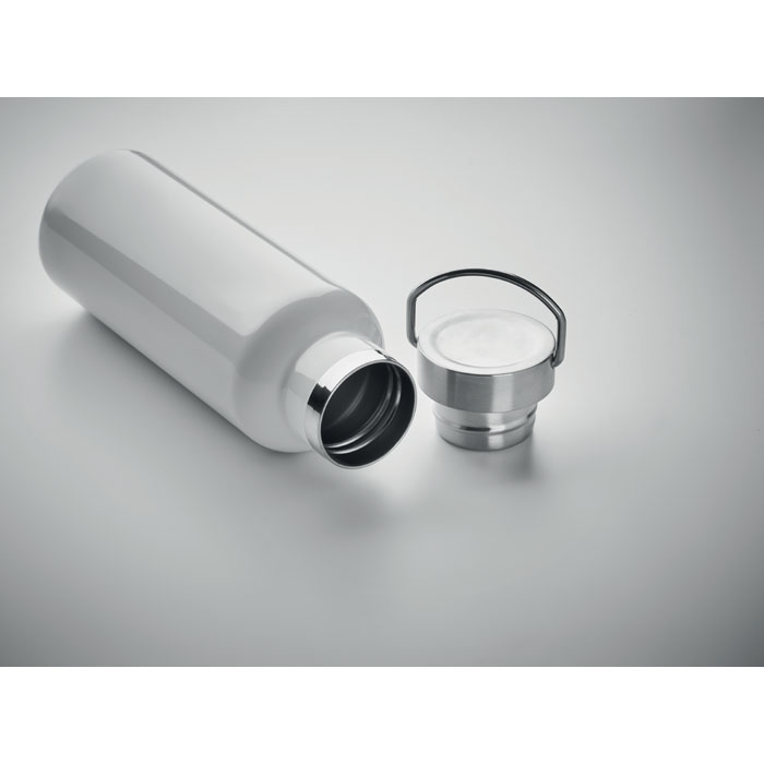 Dwuścienna, izolowana próżniowo butelka ze stali nierdzewnej z recyklingu (90% recyklingowanej stali nierdzewnej i 10% stali nierdzewnej) z zakrętką z uchwytem. Pojemność: 500 ml.