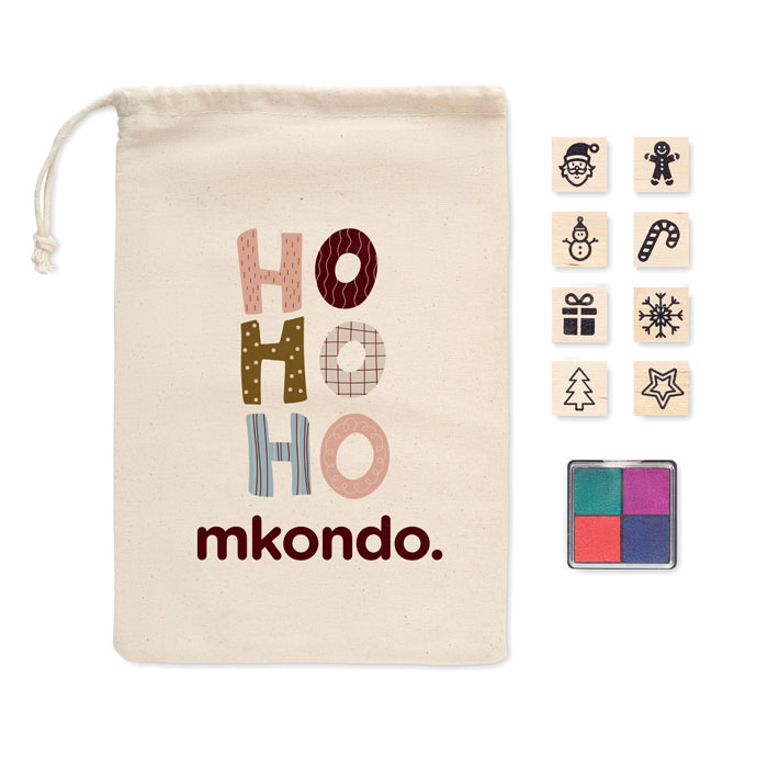 Zestaw 8 drewnianych stempli świątecznych w bawełnianej torbie ze sznurkiem.
