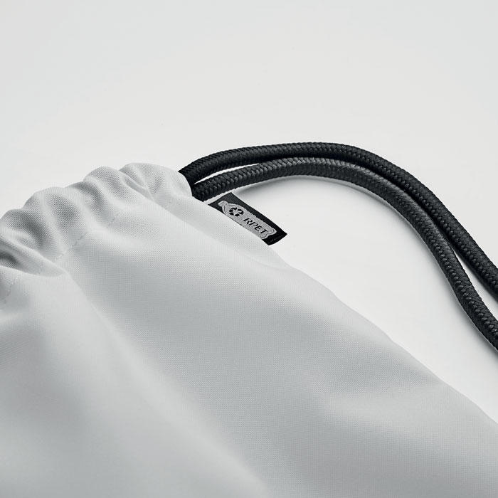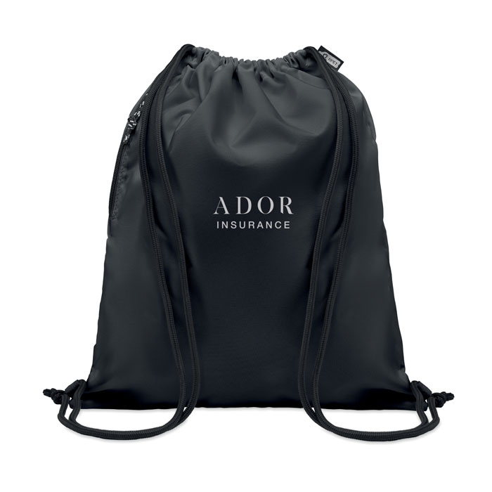 Duży worek ze sznurkiem ściągającym z poliestru 300D RPET z boczną kieszenią zewnętrzną zapinaną na zamek.