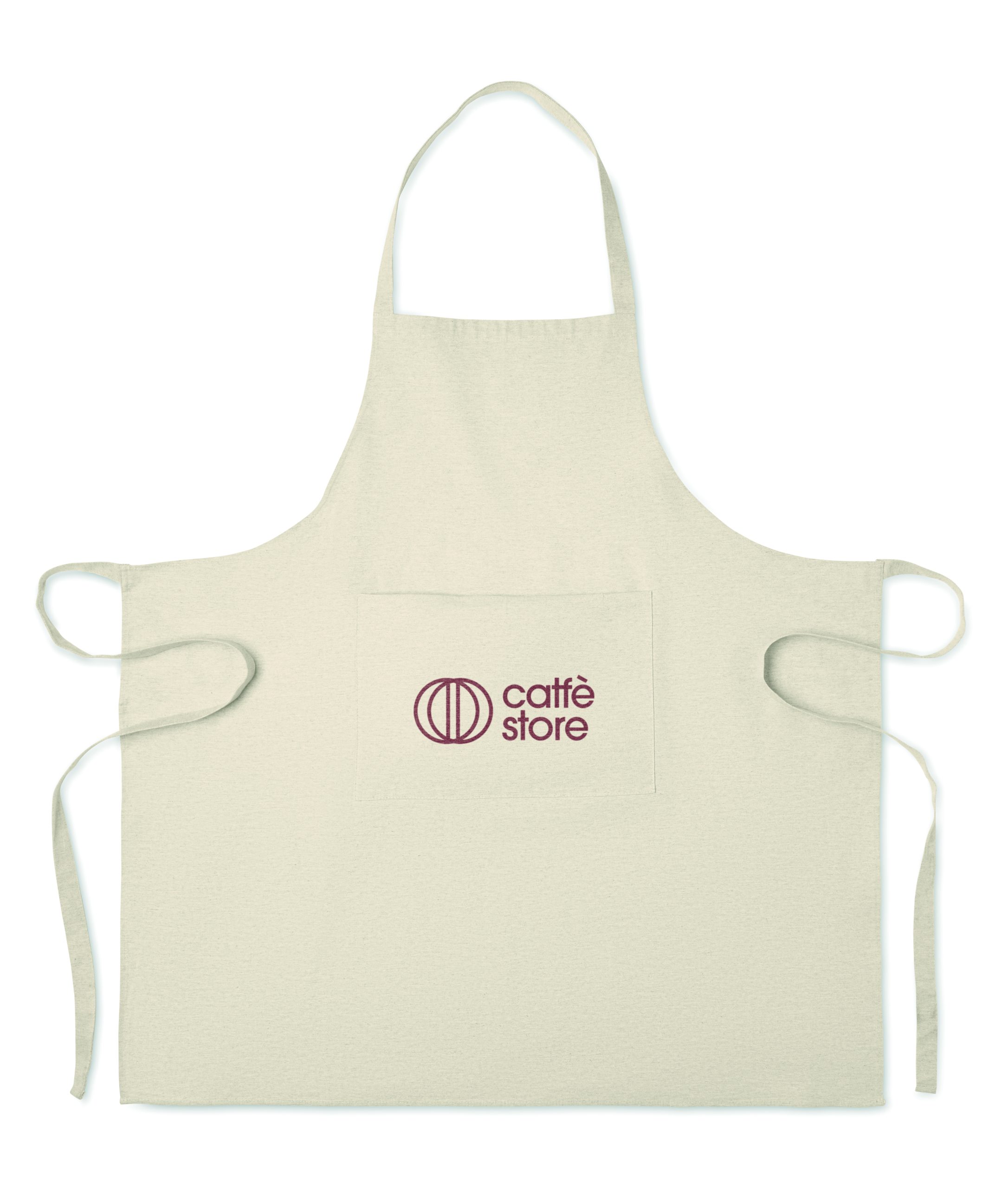 Regulowany fartuch kuchenny z 1 przednią kieszenią wykonany z bawełny z recyklingu o gramaturze 220 gr/m². (80% bawełny z recyklingu, 20% zwykłej bawełny)