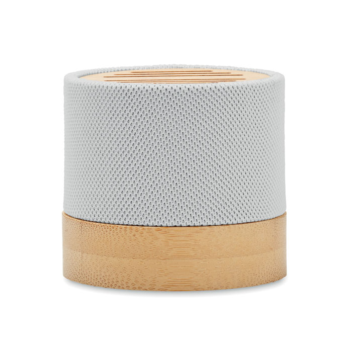 Głośnik bezprzewodowy 5.0 z RPET z bambusowym elementem. Sygnalizacja LED. 1 Akumulator Li-ION 300 mAh. Zawiera port kart SD oraz kabel AUX/USB. Wyjście: 3W, 3 Ohm i 5V. Czas odtwarzania ok. 3h. Bambus jest produktem naturalnym, dlatego mogą wystąpić nieznaczne różnice w kolorze, wzorze i rozmiarze.