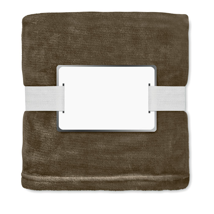 Koc z flaneli RPET 280 gr/m² ze wstążką i etykietą do nadruku.