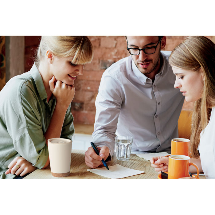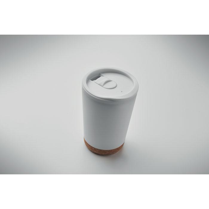 Kubek o podwójnych ściankach z PP z korkową podstawą i zamykaną pokrywką z ustnikiem z PS. Pojemność: 300 ml.