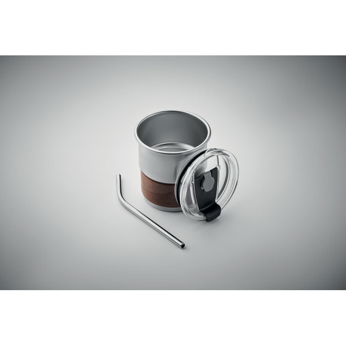 Jednościenny kubek z recyklingowanej stali nierdzewnej (90% stali nierdzewnej z recyklingu i 10% stali nierdzewnej) z odłączanym uchwytem z drewna akacjowego i słomką ze stali nierdzewnej. Szczelna pokrywka z otworem na słomkę i otworem do picia. Pojemność: 260 ml. Ponieważ jest to kubek z pojedynczą ścianką, może dochodzić do wymiany ciepła.