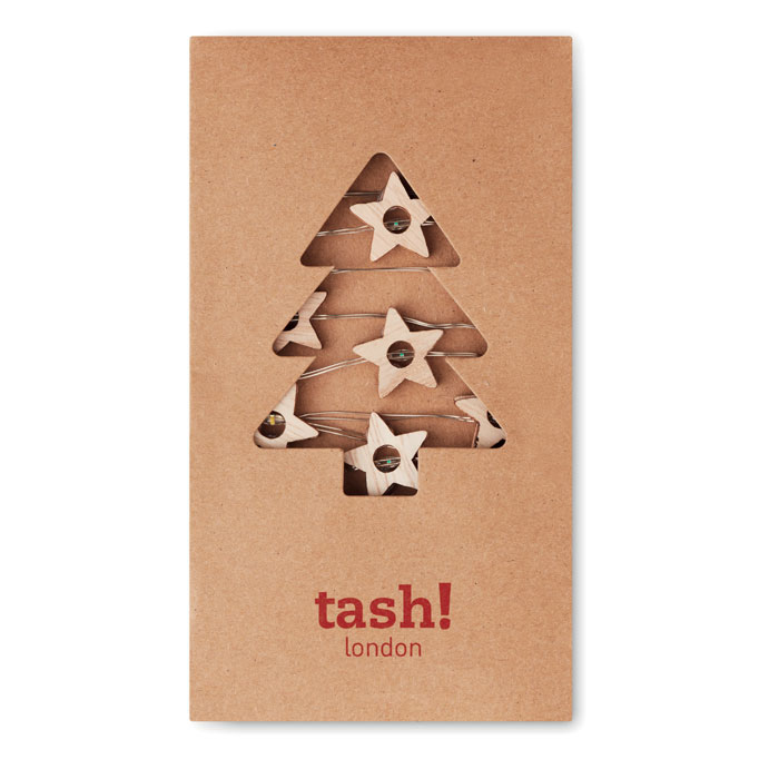 Łańcuch świetlny 20 LED, lampki w kształcie drewnianych gwiazdek. Zapakowany w kartonowe pudełko. 2 baterie AA nie dołączone. Przycisk włączania / wyłączania w obudowie baterii.
