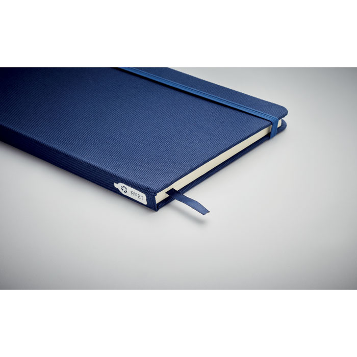 Notatnik A5 z twardą okładką 600D RPET. 160 stron (80 kartek) w linie z papieru ekologicznego. Dopasowany elastyczny pasek zamykający i zakładka z tasiemki. FSC®-certified | FSC MIX CREDIT, P7.1, FSC-C213206