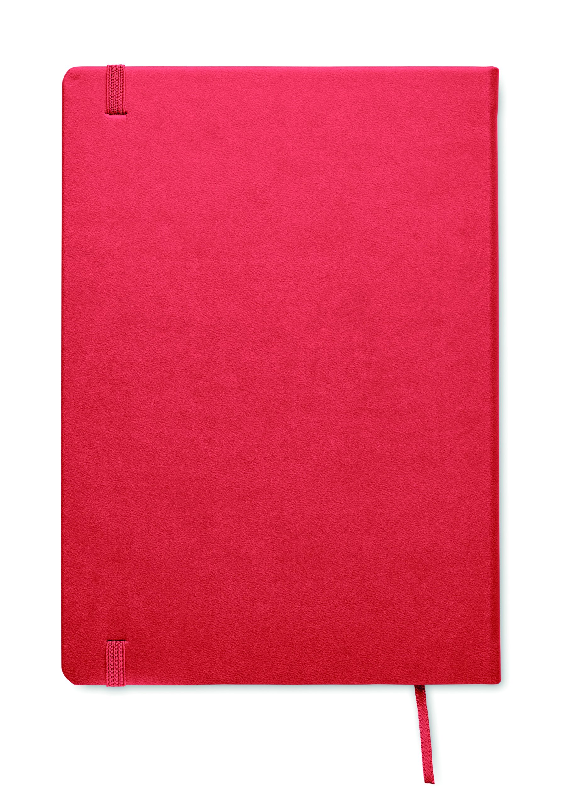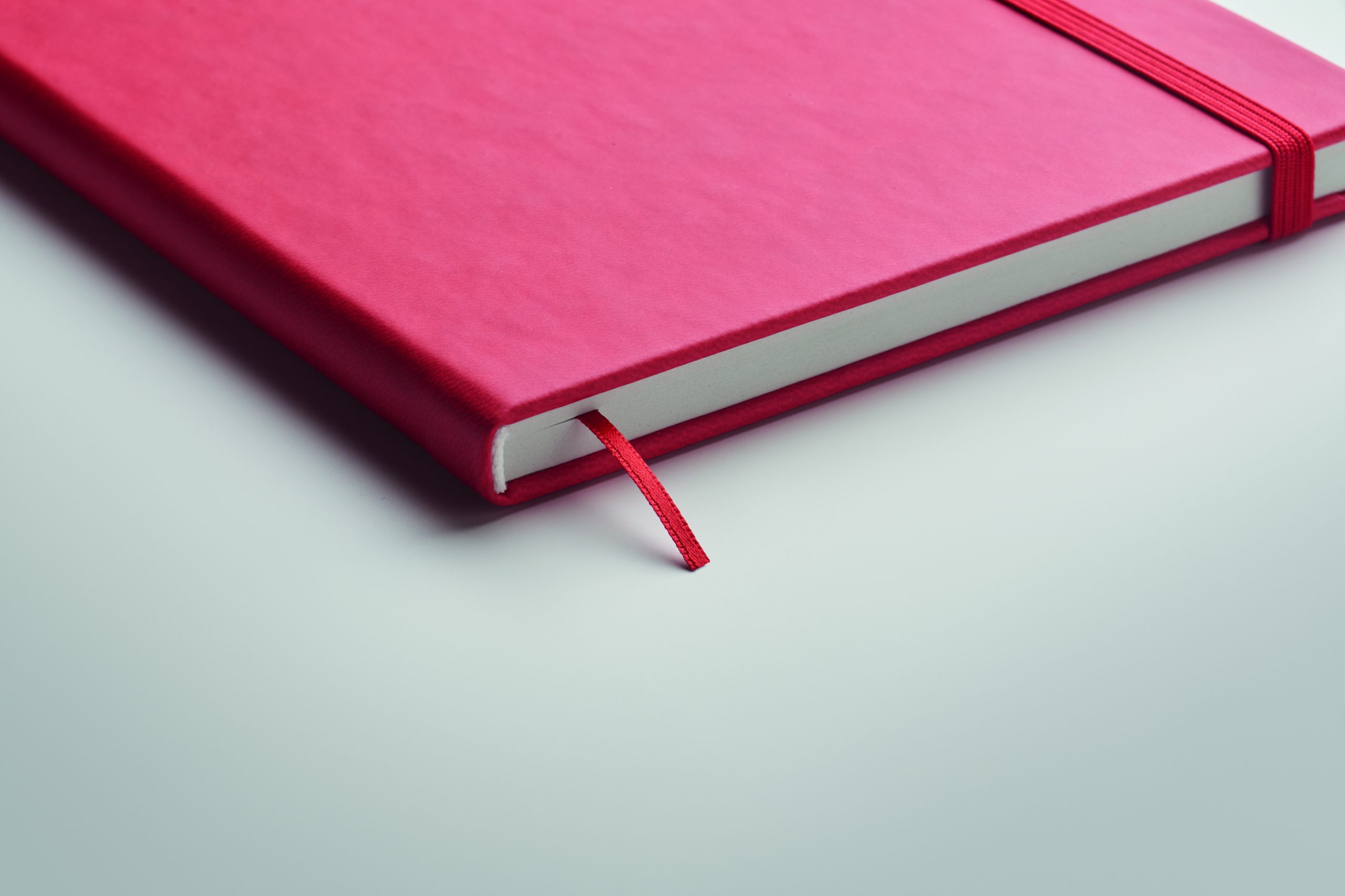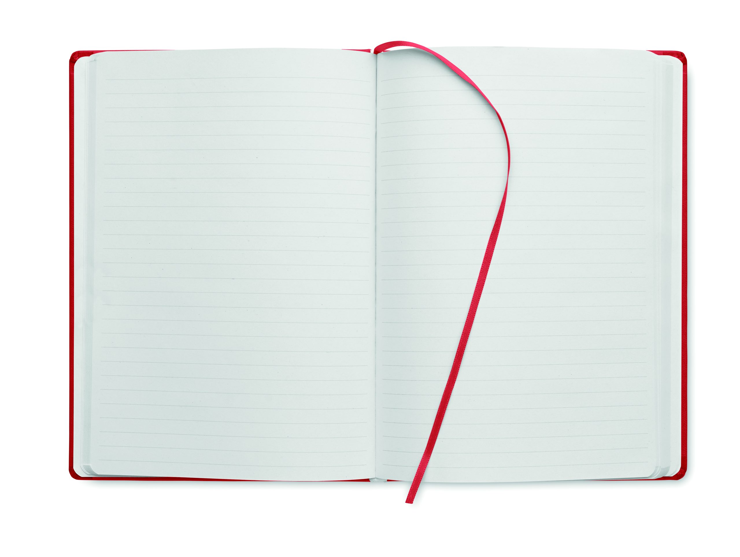 Notatnik A5 z twardą okładką z PU. 200 strony w linie (100 kartek) z papieru z recyklingu (80 g/m²). Dopasowana gumka zamykająca i tasiemka do zaznaczania stron. Wyprodukowano w UE.