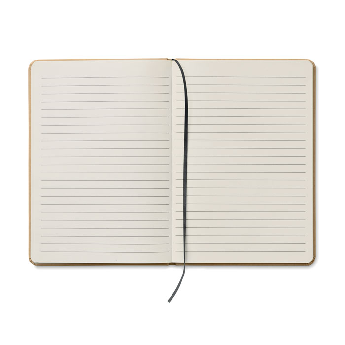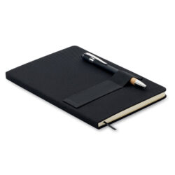 Notatnik A5 z twardą okładką z kartonu pochodzącego z recyklingu. 160 stron w linie (80 arkuszy papieru z recyklingu). Elastyczny pasek zamykający i pętelka na długopis, zakładka ze wstążki, długopis z przyciskiem i korpusem z papieru z recyklingu. Niebieski tusz.