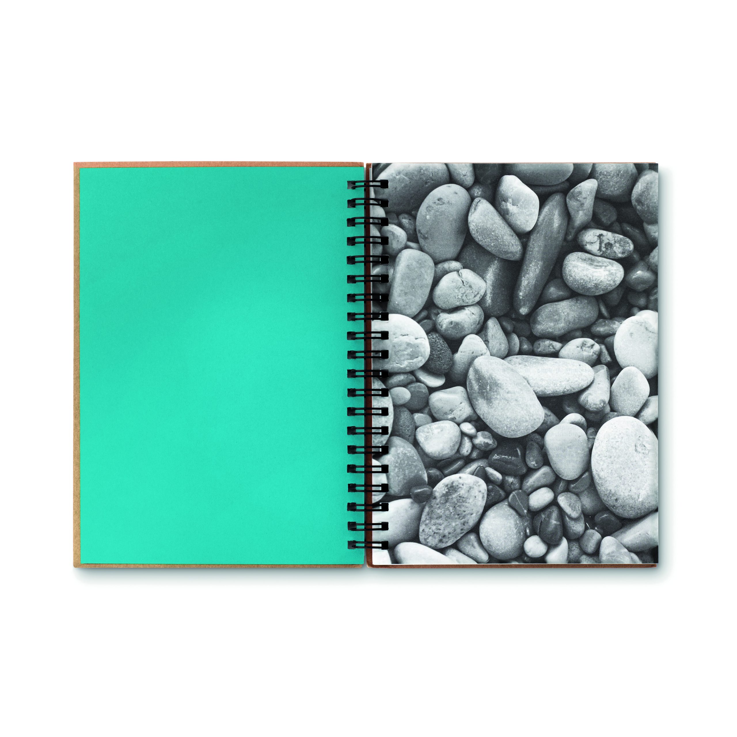 Notatnik z okładką z kartonu z recyklingu. Podwójna spirala. 140 stron w linie z papieru mineralnego (70 arkuszy). Papier mineralny jest wykonany z węglanu wapnia i HDPE (żywicy polietylenowej) stosowanej jako spoiwo. Jest wodoodporny i odporny na tłuszcz.