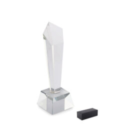 Okrągła kryształowa nagroda lub tabliczka pamiątkowa na drewnianej podstawie z drewna bukowego, w pudełku upominkowym.
