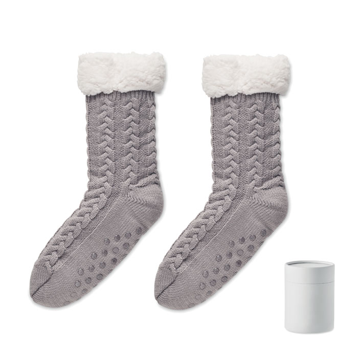 Para skarpet kapciowych z antypoślizgowymi elementami, wykonana z akrylowego sznurka, z podszewką z futerka sherpa o grubości 240 gr/m². Zapakowana w pudełko upominkowe. Rozmiar L= 40-43.