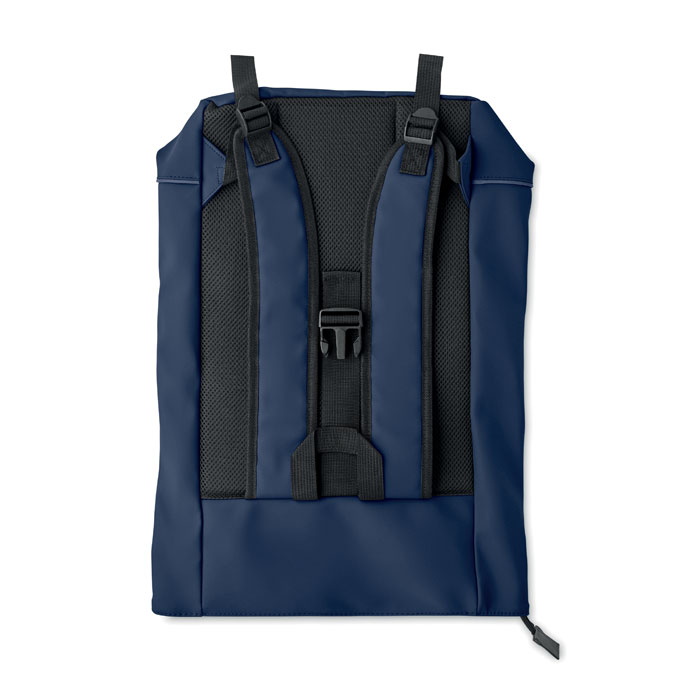 15-calowy plecak na laptopa z miękkiego PU z wyściełanym tyłem i wzmocnieniem podstawy z odblaskowym paskiem. Wodoodporna kieszeń przednia zapinana na zamek. Podszewka z poliestru 210D RPET.