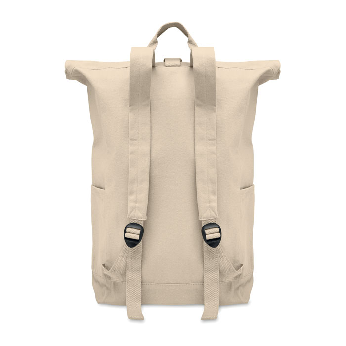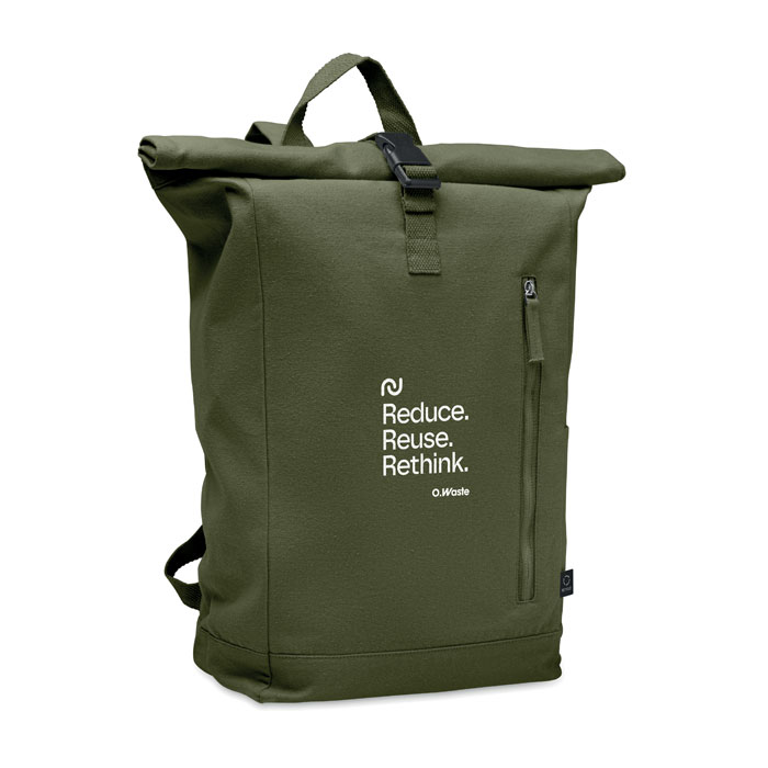 Plecak z zapięciem na rzep wykonany z bawełny z recyklingu o gramaturze 390 gr/m² (80%) i poliestru z recyklingu (20%). Przednia kieszeń zapinana na zamek.