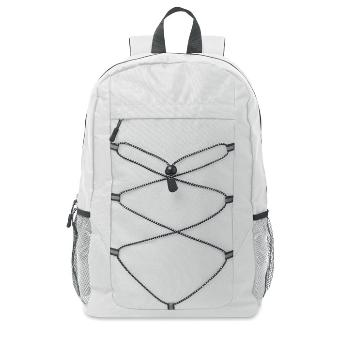 Plecak z poliestru 600D RPET z ozdobnym sznurkiem i przednią kieszenią zapinaną na zamek. Siateczkowe kieszenie po obu stronach.