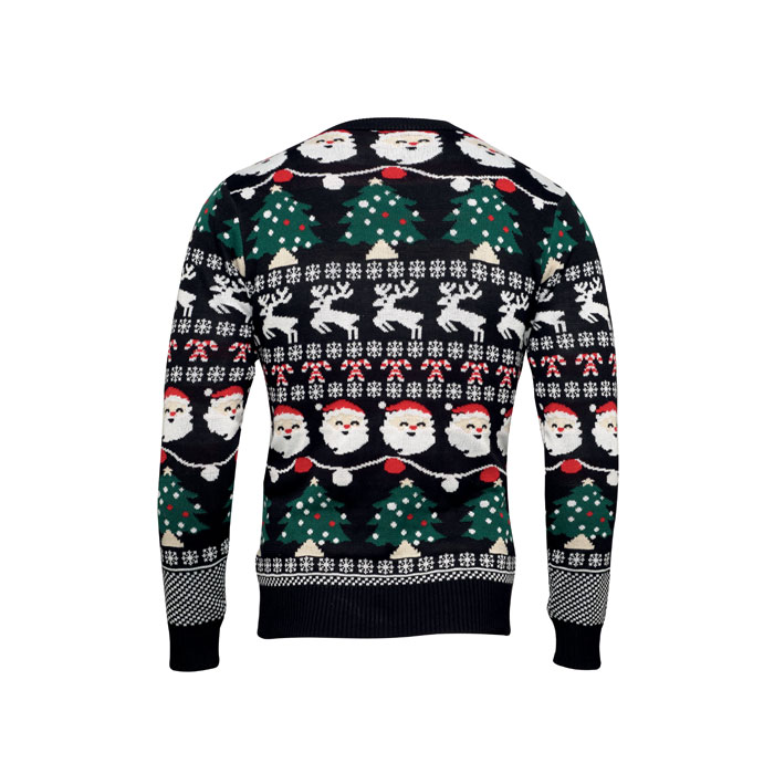 Świąteczny sweter z akrylu z 10 światełkami LED. Rozmiar: S/M. Pokaż się stylowo w pracy lub na rodzinnej kolacji bożonarodzeniowej w tym świątecznym swetrze. Wyjmowana komora na baterie. W zestawie 2 baterie CR2032.