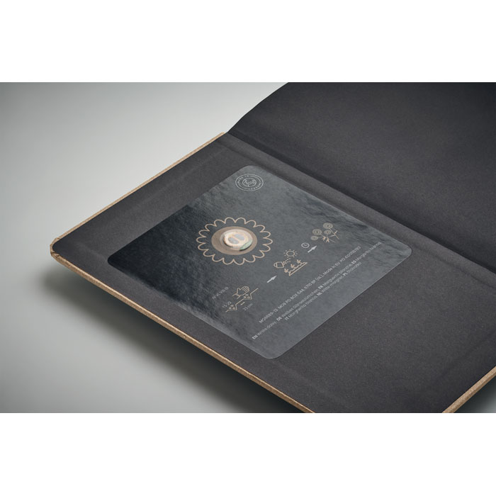 Zeszyt A5 w twardej okładce. 184 strony (92 kartki) w linie. Papier pochodzi z recyklingu. Zakładka z bawełnianej tasiemki. Zawiera nasiona roślin. Wyprodukowano w UE. Ten ekologiczny notatnik doskonale wpisuje się w nurt zrównoważonych produktów promocyjnych. Jest wyjątkowym upominkiem reklamowym. W środku znajdują się nasiona, które możesz zasadzić. Każdemu kolorowi okładki przyporządkowana jest inna roślina. Borówka (04), truskawka (05), biała stokrotka (13), jabłoń (48) oraz sosna (60).