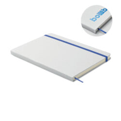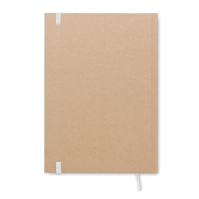 Notatnik A5 w twardej okładce z kartonu z recyklingu. 200 stron w linie z papieru makulaturowego (100 kartek 80 g/m²). Dopasowana gumka zamykająca i tasiemka do oznaczania stron. Made in EU.
